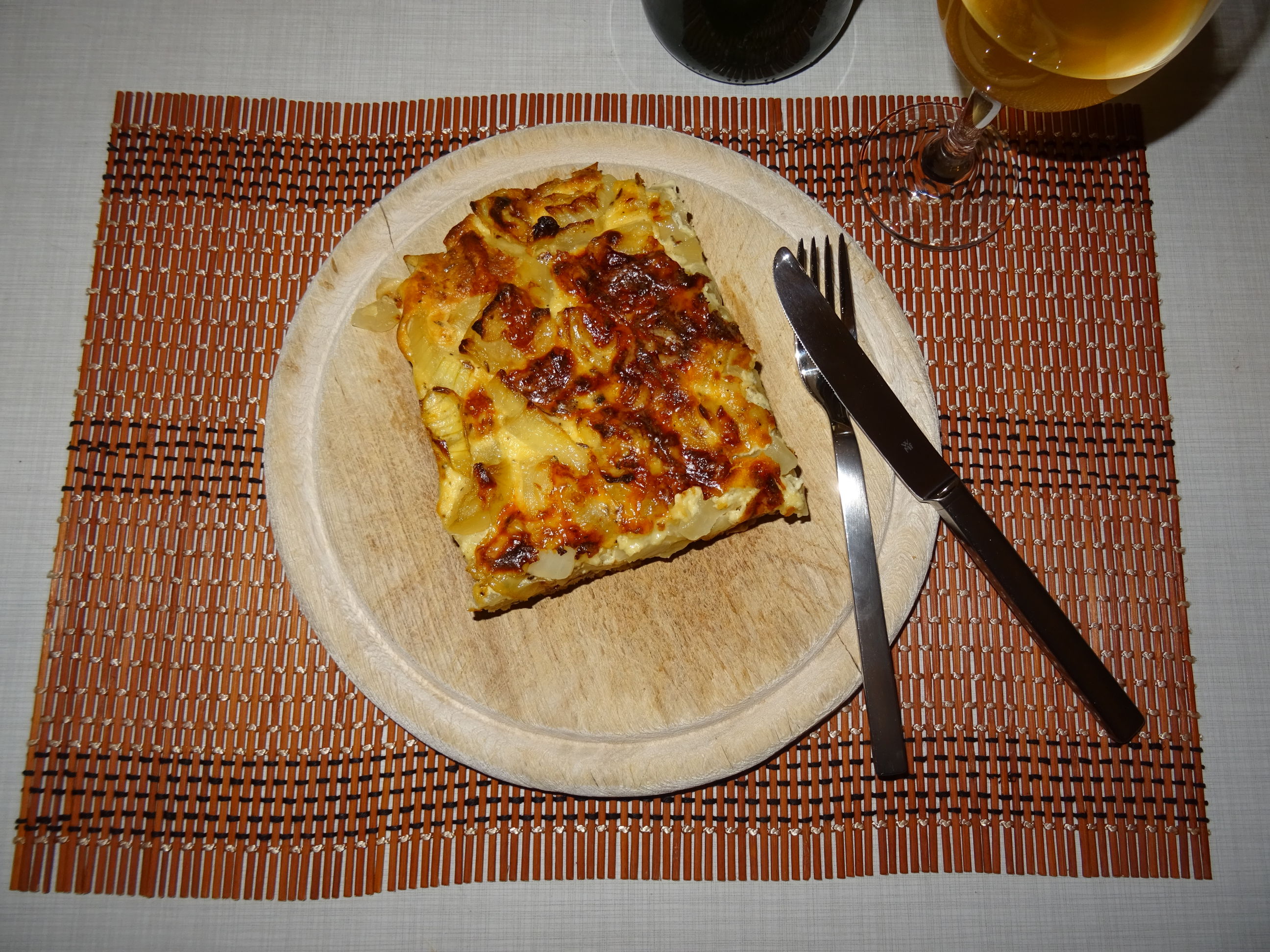 Den Teig nach der Ziehzeit in die entsprechende mit Backpapier ausgelegte Form geben (diese sollte hoch genug sein, damit die Sauce im Ofen beim Backen nicht überläuft!), dann die Zwiebeln verteilen und die Sauce hinübergeben. Zum Schluss nochmals nach Belieben noch frisch Kümmel und Belem-Pfeffer drüber mahlen und mit etwas frisch geraspeltem, würzigem Hartkäse bedecken.