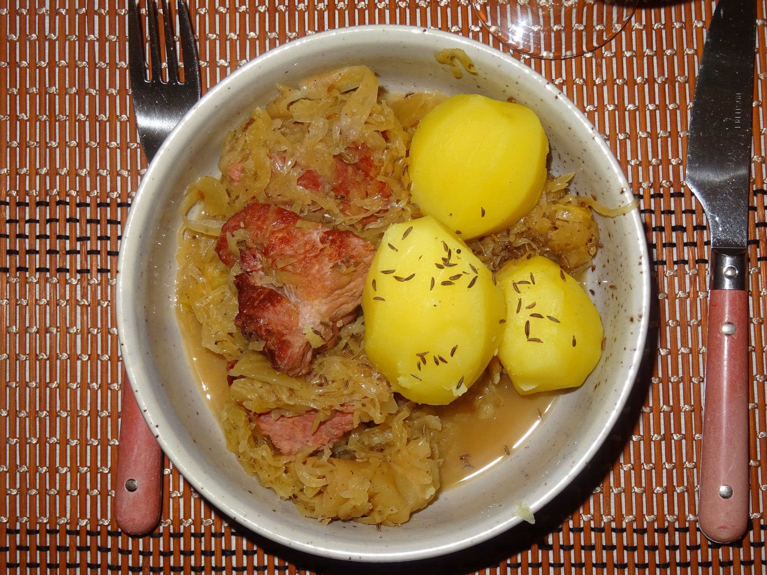 Das Kassler in grobe Stücke zerlegen und in Rapsöl scharf anbraten, dann aus dem Topf herausnehmen. Jetzt in dem Fett die Zwiebeln anschwitzen, bis sie glasig werden. Nun die Ananasstücke hinzugeben und leicht bei hoher Temperatur karamellisieren. Mit etwas Weißwein die Röstaromen vom Topfboden aufkochen, dann das Sauerkraut sowie Pfeffer und Kümmel hinzugeben und alles aufkochen. Nach ca. 15 Minuten das Kassler wieder hinzugeben und unter gelegentlichem Umrühren weitere 45 Minuten bei mittlerer Temperatur köcheln lassen. Zwischendurch etwas Weißwein hinzugeben, allerdings sollte das Ganze nicht zu flüssig werden! Zum Schluss mit Salz und Apfelsirup abschmecken und noch etwas bei geringer Temperatur ziehen lassen.