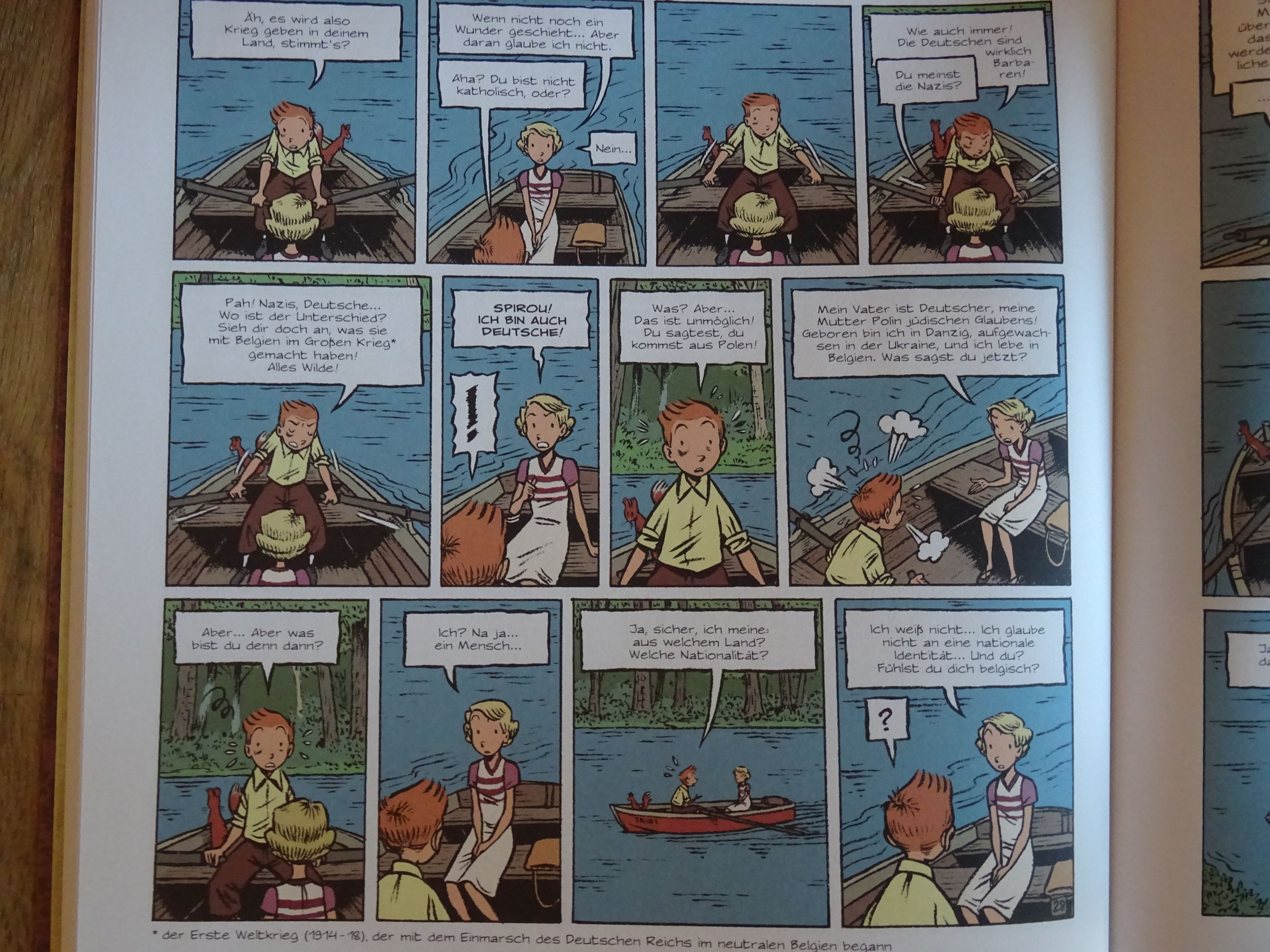 Unsere Geschichte beginnt im Sommer 1939 im Hotel Moustic in Brüssel, in dem ein geheimes Treffen zwischen den Vertretern Nazi-Deutschlands und Polens um eine (vermeintlich) friedliche Lösung des anschwelenden militärischen Konfliktes zu erreichen. Und Spirou – uns Hauptprotagonist und Held dieser Geschichte – ist erstmal abwesend und versucht, mehr oder minder erfolgreich, einen Kinderstreit beim Fußball zu schlichten, bei dem es weniger um Fußball als um politische Ansichten geht. Und daher erscheint Spirou auch gleich mal zu spät und angeschlagen zur Arbeit, was ihm gleich den (wiederholten) Zorn seines Vorgesetzten Entresol beschert. Und hier mit beginnt unsere fünfbändige und über 400 Seiten umfassende Geschichte, die Spirou (und auch Fantasio, den er zu Anfang dann kennenlernt), durch die Zeit des Dritten Reichs, durch Brüssel, durch Belgien, durch Höhen und Tiefen führt, bei der er Freunde und Verräter trifft, viele Situationen erlebt, die ihn (und den Leser) über noch viel mehr reflektieren lässt – manchmal mit viel Naivität und Humor, manchmal aber auch bei tiefgreifenden, tragischen Ereignisse mit Trauer, Skepsis oder anfänglicher Hoffnungslosigkeit, die dann aber schnell in Glauben, Vernunft und Hoffnung umschlägt und unserem Helden wie auch dem Leser eine neue Perspektive aufzeigt…