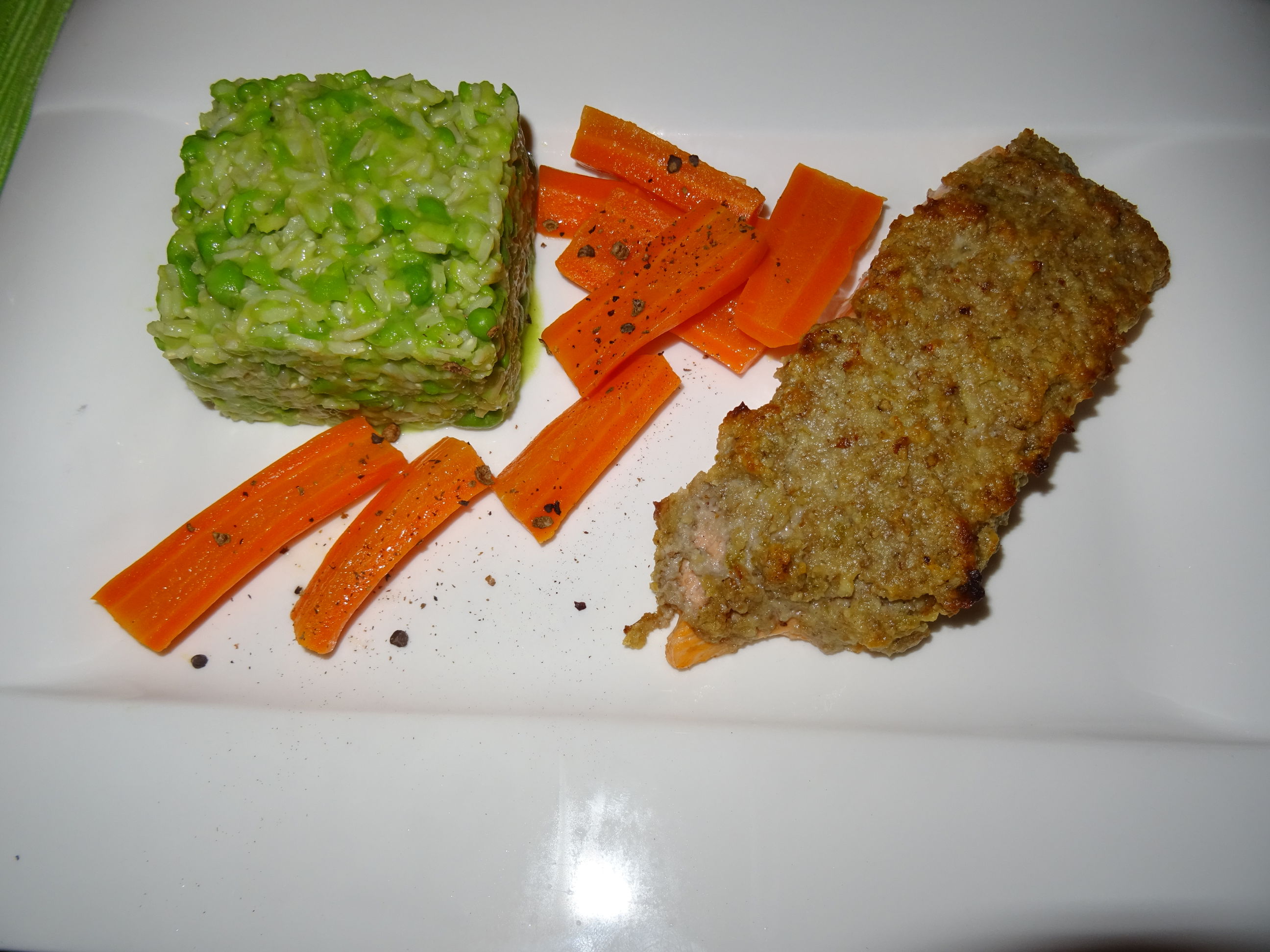 Lachs in Walnuss-Limetten-Kruste auf Erbsenreis