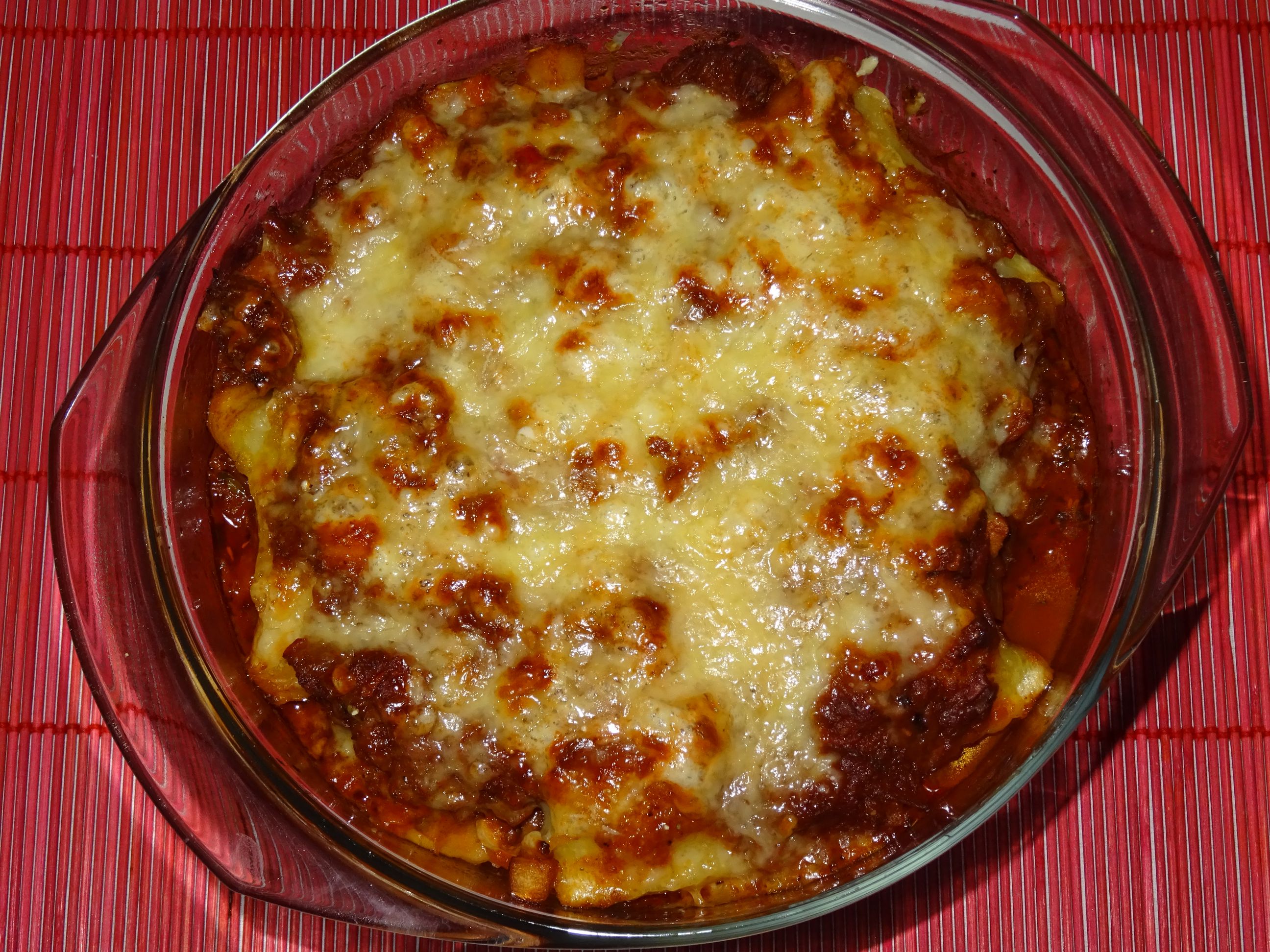 Jetzt die die Auflaufform mit Öl einfetten. Nun die Maultaschen von beiden Seiten goldbraun anbraten und dann Lagen-weise in die Form legen und zwischen jeder Lage mit der Sauce bedecken. Final mit dem Käse überdecken und bei 180°-200° für ca. 30-40 Minuten zugedeckt in den Ofen, anschließend abgedeckt den Käse noch goldbraun werden lassen.